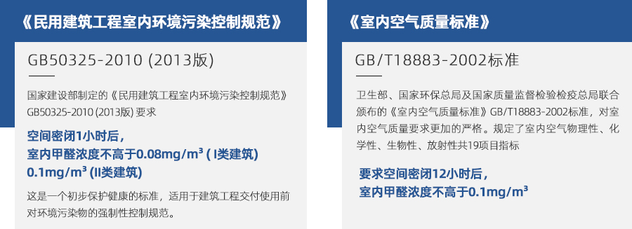 室內空氣檢測分為兩種標準,一種是《室內空氣質量標準》GB/T 18883-2002,一種是《民用建筑工程室內環境污染控制規范》GB 50325-2010(2013版)。